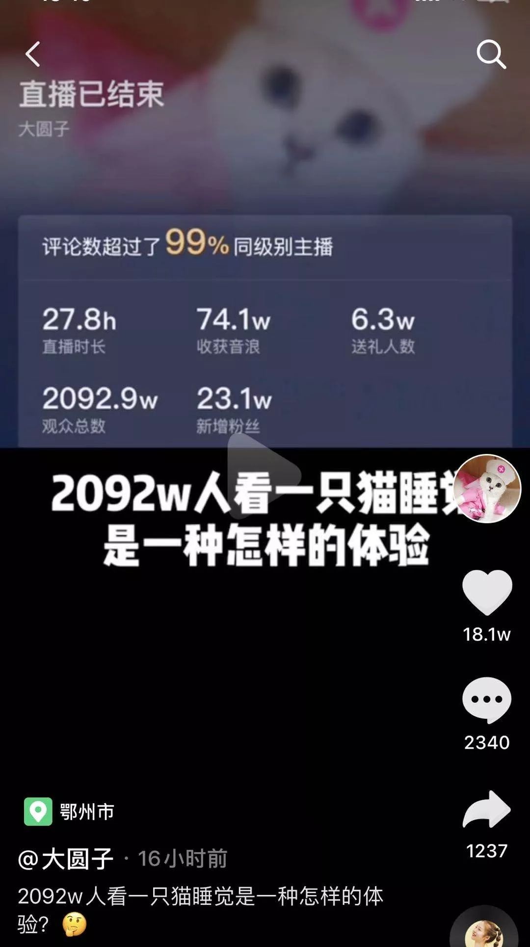 仿佛蝴蝶效应一般,圆三不再睡觉了,一只猫的睡觉直播又在抖音上走红了。前晚,抖音萌宠号「大圆子」上线直播,2092万人云撸猫,慷慨贡献7.4万元打赏。