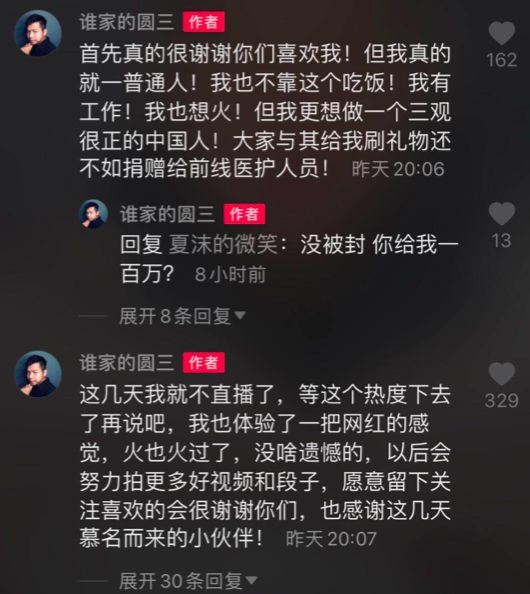一方面,平台规则对直播睡觉内容是有限制的。第三次直播时,圆三被中途禁播了10分钟。另一方面,圆三发现自己不管发什么视频,关注他的人都会让他去睡觉。他曾在视频里说自己不想直播睡觉了,结果立马掉了4万粉丝。