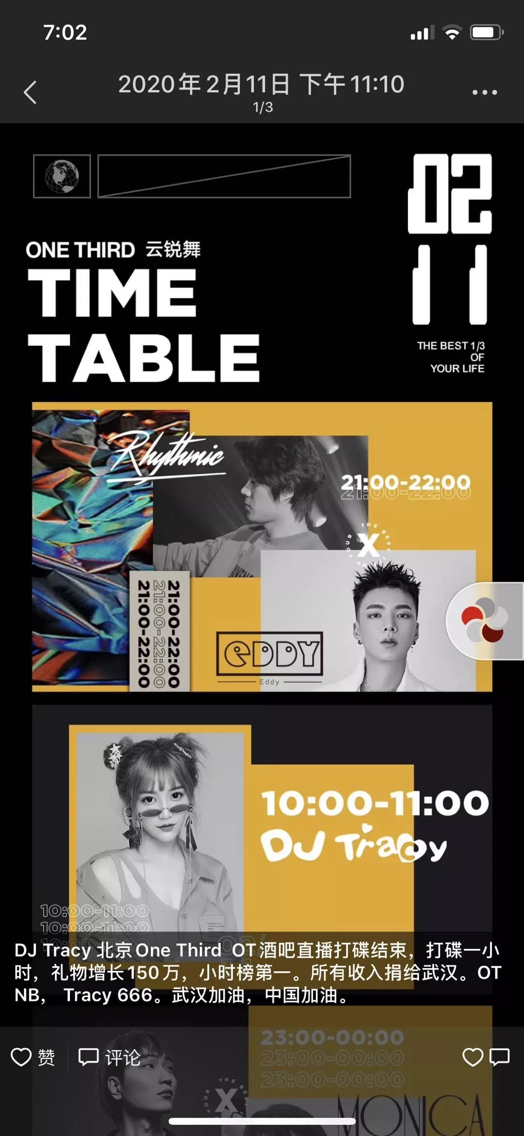 2月11日,ONETHIRD在直播中邀请了嘉宾DJ Tracy。当晚,Tracy创下了1小时收入150万音浪的成绩,价值约15万人民币,一同归入了ONETHIRD的公益通道。