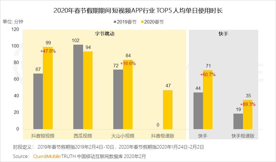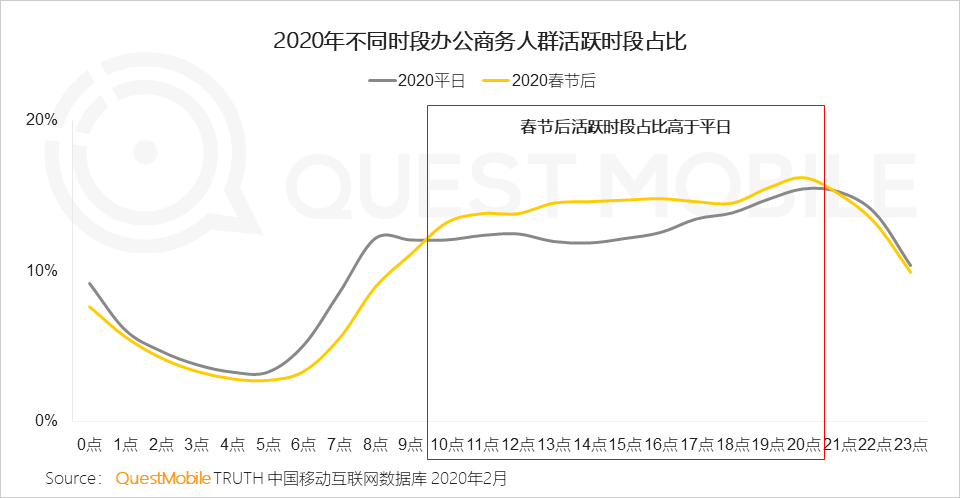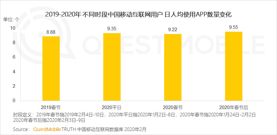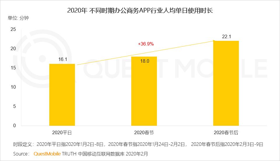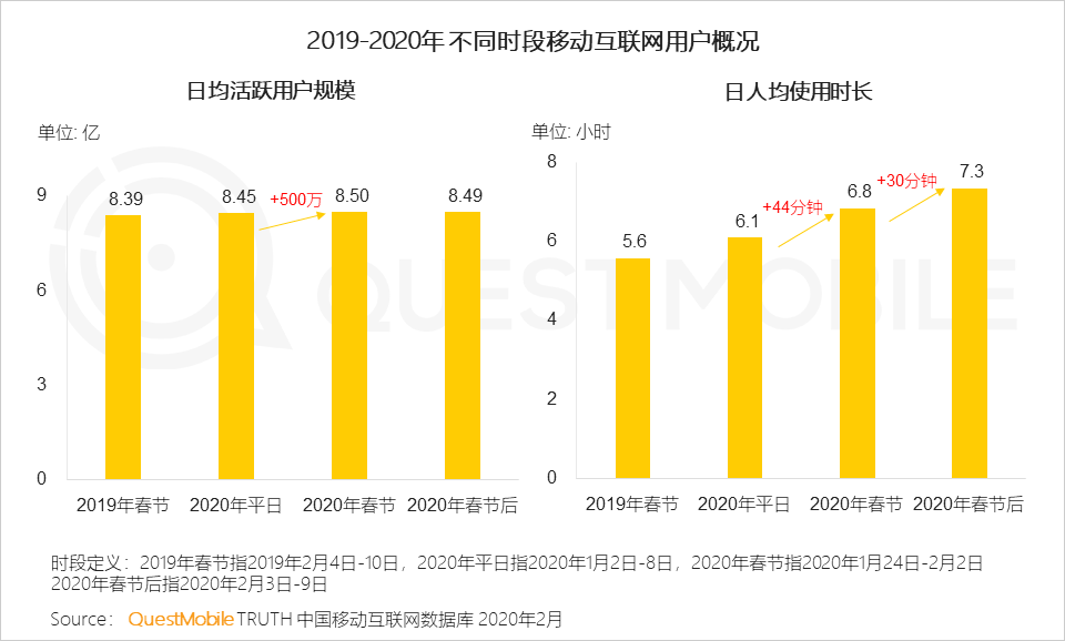 QuestMobile数据显示,春节假期之后,由于远程办公、学习的需求上升,人均使用时长进一步增加了30分钟飙涨至7.3小时(2019年春节5.6小时、2020年平日6.1小时,2020年春节6.8小时),马上要突破8小时工作制大关了。