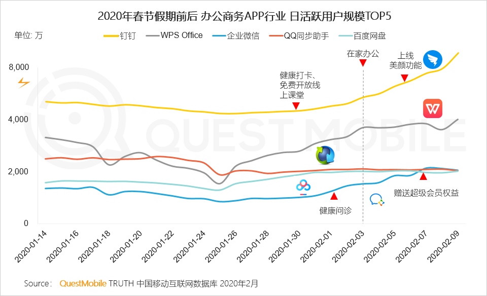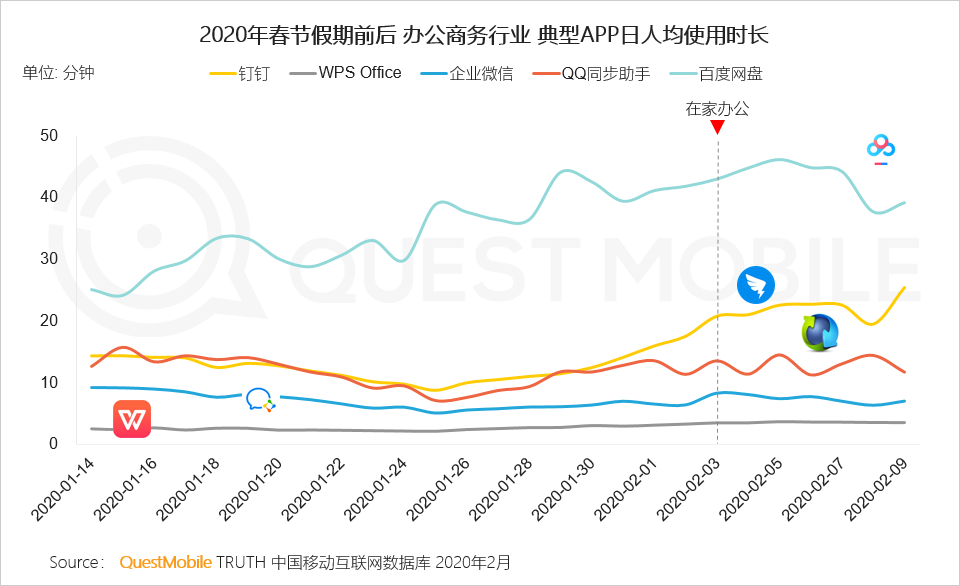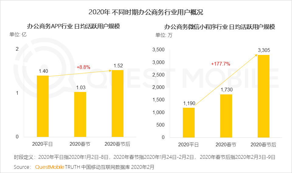 Ⅰ 春节假期后,职场人士开始在家“云办公”,拉动办公商务行业用户规模增长,钉钉、微信会议等产品扩容和免费政策进一步降低使用门槛、提升用户粘性