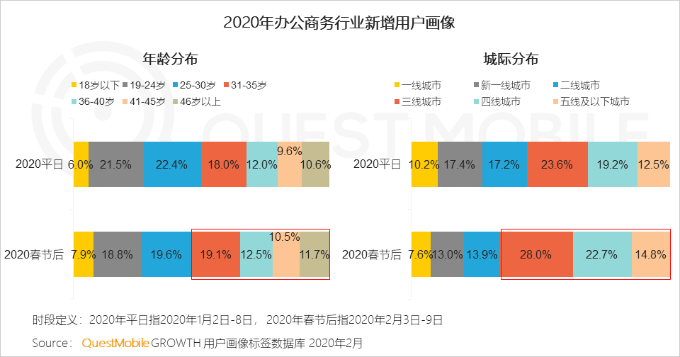 Ⅱ 在线办公对三线及以下的下沉用户拉动作用显著,春节后新增用户中下沉用户占比平日上涨约10个百分点,达到65.5%