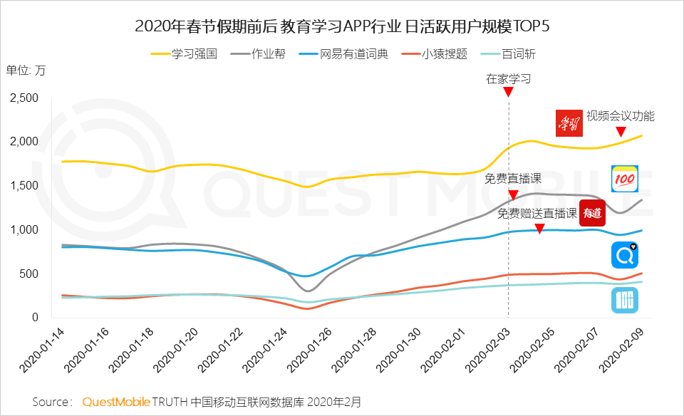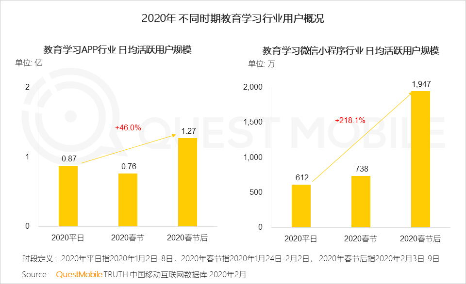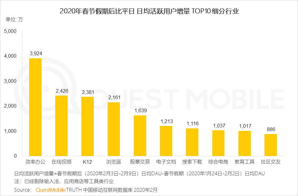 4、春节后一周,远程办公和在线学习的需求明显上升,效率办公领域日均活跃用户规模上涨近4000万、K12上涨过2000万,2月3日股票市场开市,股票交易行业也迎来增长