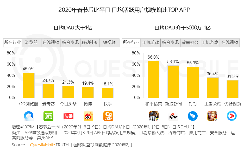 春节假期后一周,用户规模增长最快的是办公、浏览器、教育等领域,增长率TOP榜来看,DAU亿级以上阵营里,前五位分别是QQ浏览器、爱奇艺、今日头条、微博、快手;DAU5000万到1亿阵营里,前五位的分别是和平精英、新浪新闻、钉钉、王者荣耀、优酷视频。