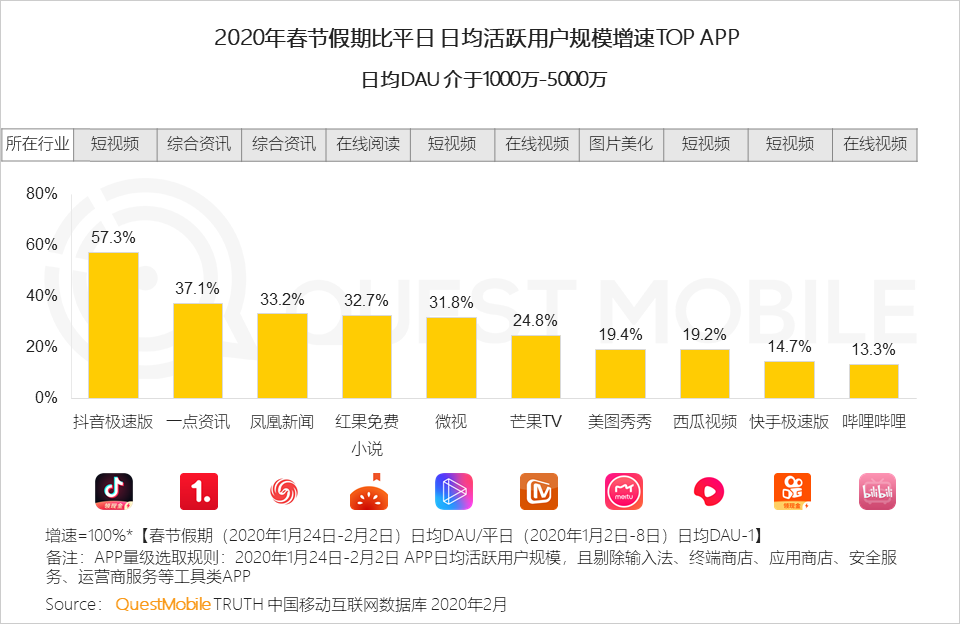 3、从用户规模增长来看,用户在春节期间的需求主要集中在泛休闲娱乐、社交、资讯、社交等相关行业
