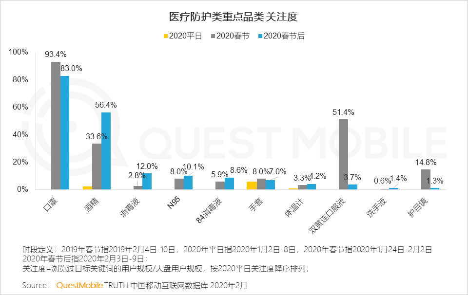 3.5 全国上下对疫情空前重视,在防护用户中,民众最为关注口罩及酒精等产品