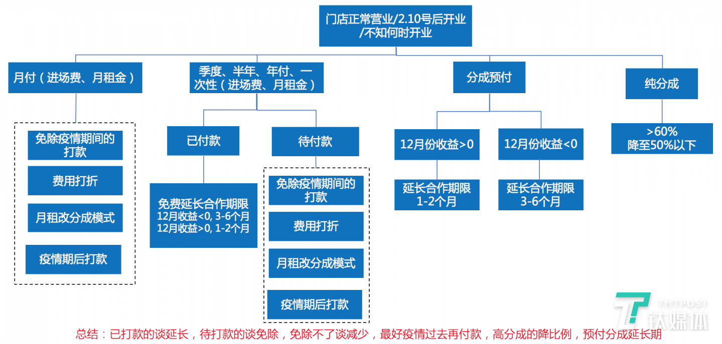 钛媒体拿到的一份资料显示,在月付、季付、分成预付、纯分成方面均有不同协商方案。在月付方案中,街电希望免除疫情期间的款项、费用打折、月租改分成模式以及疫情期后再打款。