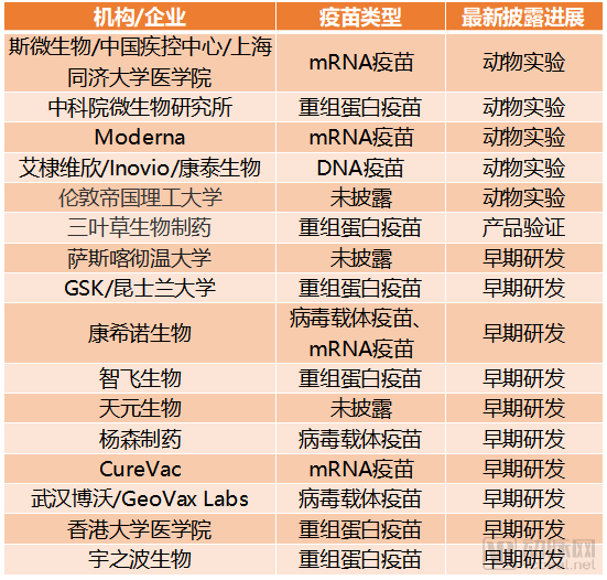 正在进行新冠病毒疫苗研发的部分企业和机构,动脉网整理