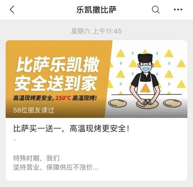乐凯撒在大年初四组建“战时特战小组”,高度聚焦火力,发力外卖。除产品外,品牌营销部重新梳理外卖平台的产品,并很快提炼出特殊时期的的品牌slogan“比萨乐凯撒,安全送到家”,“高温现烤更安全,250℃高温现烤”。2月1日,品牌营销部联动官方微信及媒体,发布了乐凯撒安全外卖和特殊时期促销产品,营业额对比前一天增长30%。