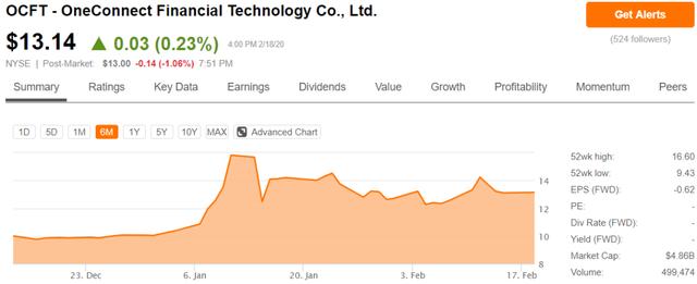 金融壹账通自上市以来,股价经历了一轮快速上涨,一度涨幅接近60%;而进入2月以来逐渐回调,目前稳定在13美元/股上下,但较发行价10美元涨幅仍然超过30%。