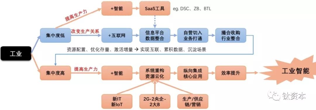另外一条路径在集中度较高的行业中:通过市场竞争,行业整合已经基本完成,行业留存基本上都是超级大客户,他们并不特别关注企业之间的竞争问题,相反更注重自己企业内部的生产效率,这时候智能化技术就可以通过重构企业内部的生产营销供应链等环节来帮助提高生产效率,因此占据了行业转型的主导地位。