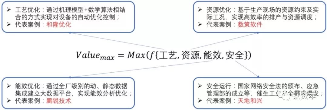 首先是工艺优化。工艺代表设备级行业的knowhow,工艺的优化非常难,要想解决此类问题,由于约束条件是随着生产过程实时变化,所以就要求既要懂设备机理模型、工艺运行参数,同时还要掌握新的数学算法,从而实现对设备的实时优化控制。例如,北京和隆优化,其主营业务方向是燃烧和化学反应核心生产过程的优化控制,首先拥有正确的技术路线,再利用机理加数学模型结合的方式,其产品在试用阶段受到了客户量化评估,三到六个月之内就可以收回投资成本,这个是工艺的优化带来的优势。