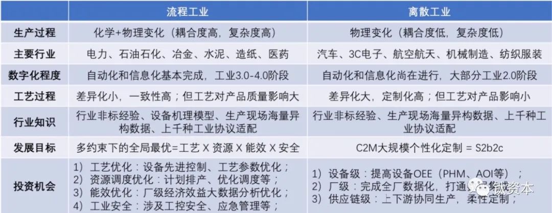 此外,二者的发展目标也不一样。离散工业的发展目标是实现大规模的个性化定制,也就是所谓的S2B2C,需要了解设备预测性维护、设备OEE等等设备级的全量数据、厂级的数据化以及供应链级上下游柔性的协同;对于流程工业则是追求在多种资源和约束条件下实现全局效率的最优解。这可以反向指导投资人在投资过程中寻找不同的影响因素。
