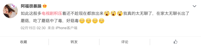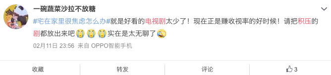 在微博上,很多网友都在抱怨剧荒,呼唤积压剧。现阶段,剧集市场的供求关系发生了明显的变化,大家日益增长的追剧需求与短缺的新剧供应之间的矛盾明显。
