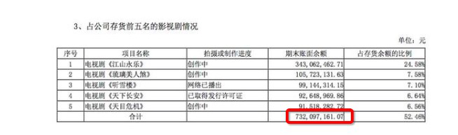 从公开信息可查,欢瑞世纪目前至少有9部杀青待播作品,分别是《山河月明》《琉璃美人煞》《天下长安》《长安诺》《天目危机》《权与利》《隐秘而伟大》《不说再见》和《秋蝉》。根据2019年欢瑞世纪发布的半年报数据,仅《天下长安》《琉璃美人煞》《听雪楼》《天目危机》《山河月明》5部剧就占据着7.3亿的成本(原名:江山永乐)。