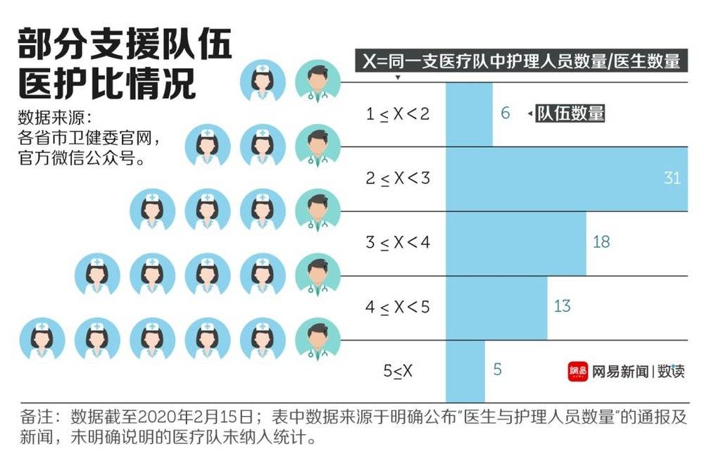 比如,在江苏省2月10日派往武汉的第三支医疗队中,就有6名医生和37名护士,医护比达到1:6.17。
