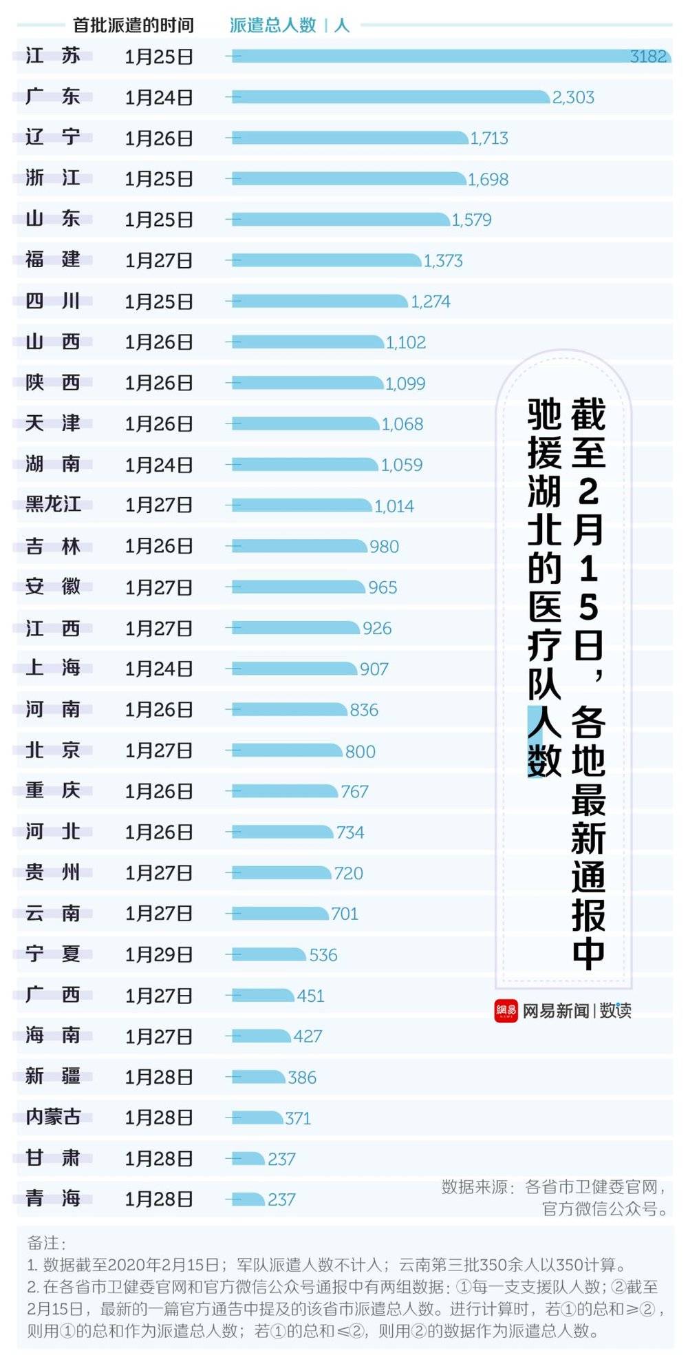 江苏省派出了最多的支援人员,有3182名。大部分省份的首批医疗队在大年初一至初三就已动身。