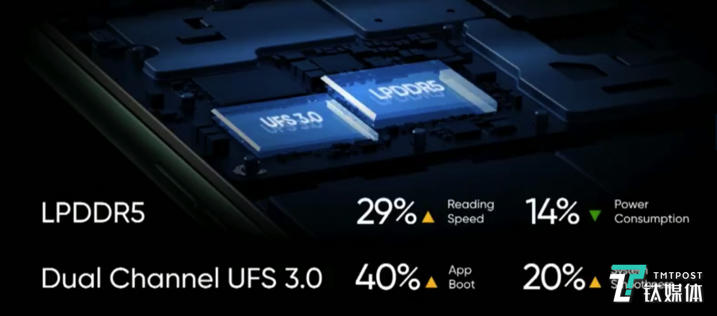 并且,真我X50 Pro 5G也首批采用LPDDR5运行内存,相对LPDDR4X,速度提升29%,功耗降低20%;全系UFS 3.0+Turbo Write+HPB,速度提升80%,功耗降低20%。