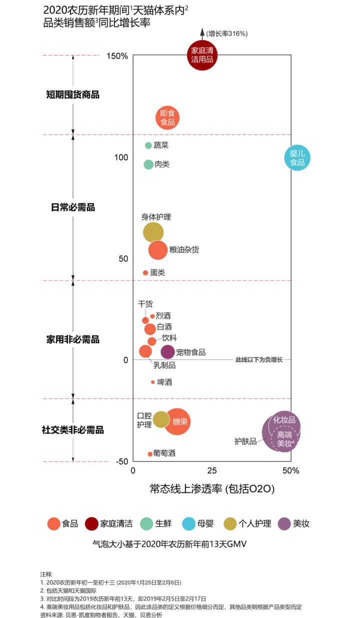 2月19日,咨询公司贝恩和天猫公布了一份报告,对比了2020年和2019年春节期间(正月初一至十三)的消费数据。