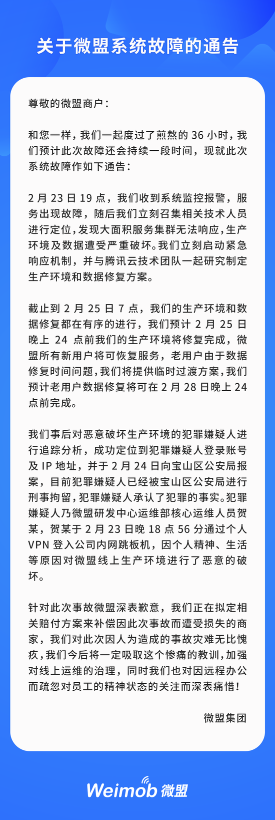 微盟方面今日发布《自愿公告SaaS业务生产环境和数据遭到破坏》,称2月23日晚7点,收到系统监控报警,服务出现故障,大面积服务集群无相应。微盟表示,本次SaaS业务数据系遭一员工“人为破坏”,而在SaaS 生产环境和数据遭到破坏后,微盟当前已暂时无法向客户提供 SaaS 产品服务。