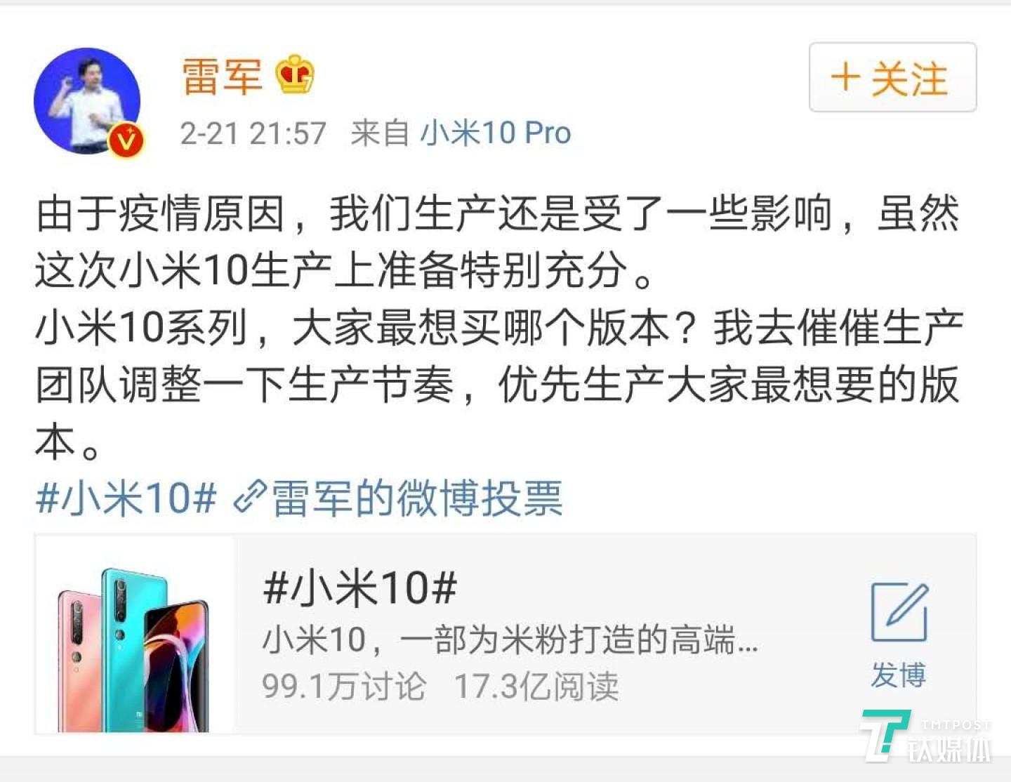 雷军称,由于疫情原因,小米的生产还是受了一些影响,虽然这次小米10生产上准备特别充分。同时他还发起了投票,询问大家最想买小米10系列哪个版本,以便自己看好去催催生产团队,调整一下生产节奏,优先供应大家最想要的版本。