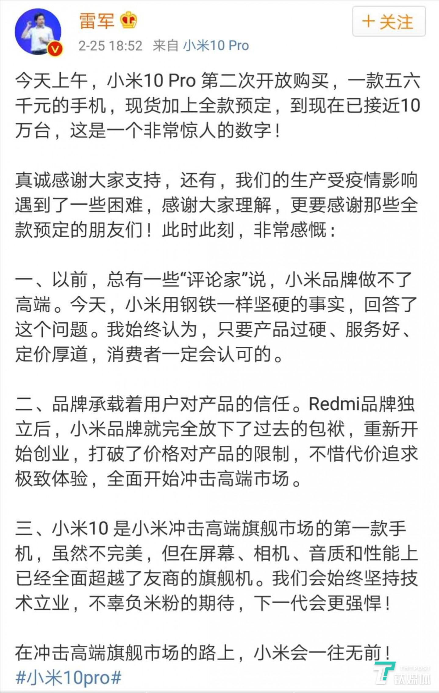 钛媒体快讯|2月26日消息:小米 10 系列开卖,高定价也引发外界争议。对此,雷军今日再次在微博上重申,“做高端旗舰机的投入非常大,卖 3999 元是真的交朋友。”