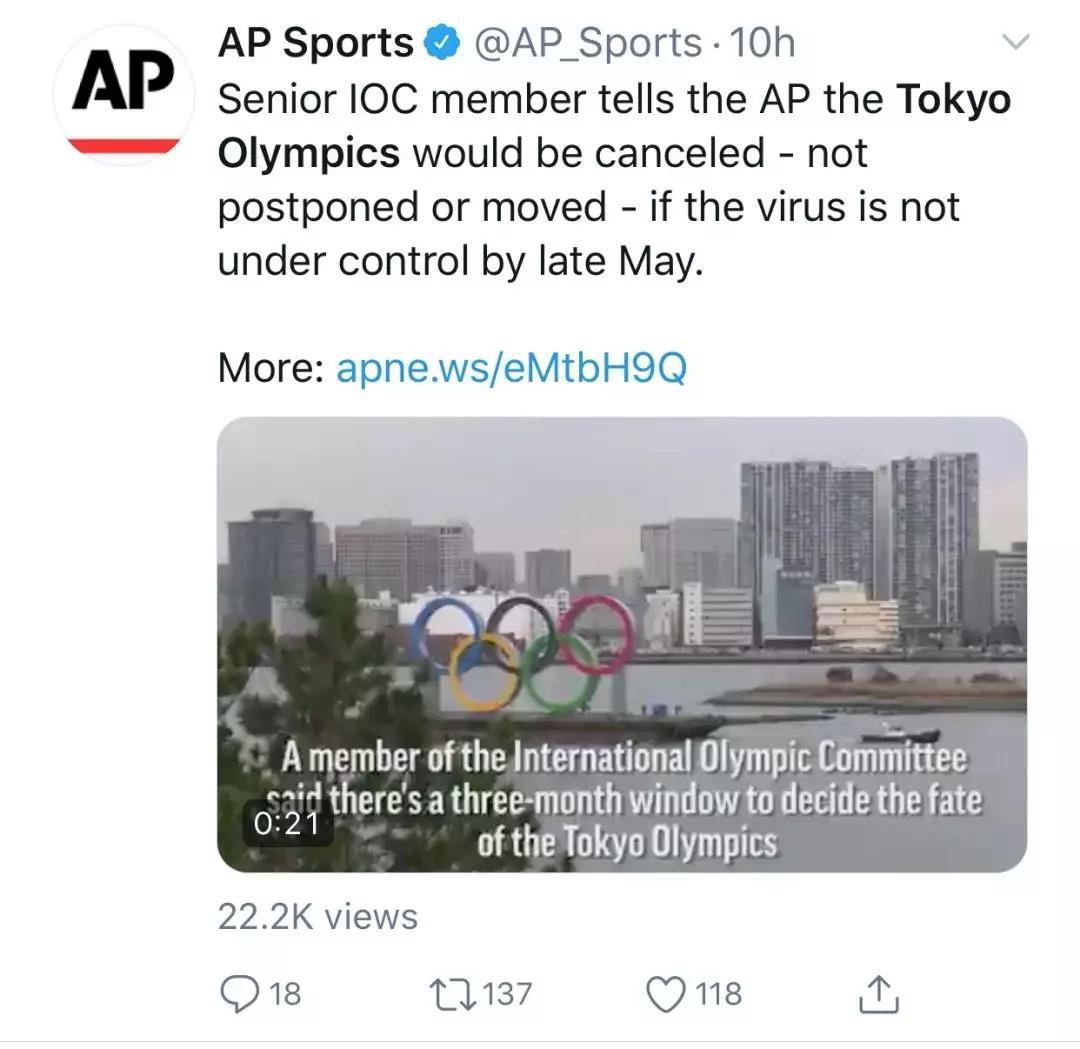 这篇原文为《IOC member casts doubt on postponing or moving Tokyo Games》的文章在美联社发布之后,随即在美联社的官方体育账号@AP_Sports上进行了转发。按照原文的表述,翻译过来的大意确实是:「若疫情5月下旬得不到控制,东京奥运或将取消」的意思。