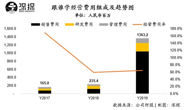 公司在2019年总的经营费用为13.6亿元人民币,尽管在绝对金额上远高于2017年和2018年,但经营费用率仅为64.5%,远低于2017年的169.1%,略高于2018年的59.2%。