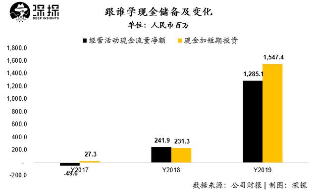 跟谁学2019年经营活动现金流量净额为12.85亿元人民币,远高于2018年的2.42亿元人民币,体现了极强的自身造血能力。公司账面现金及短期理财余额也达到历史最高的15.5亿元人民币。这样的现金情况,可以使公司在未来进行拉新等经营活动中,处于更加从容的地位。