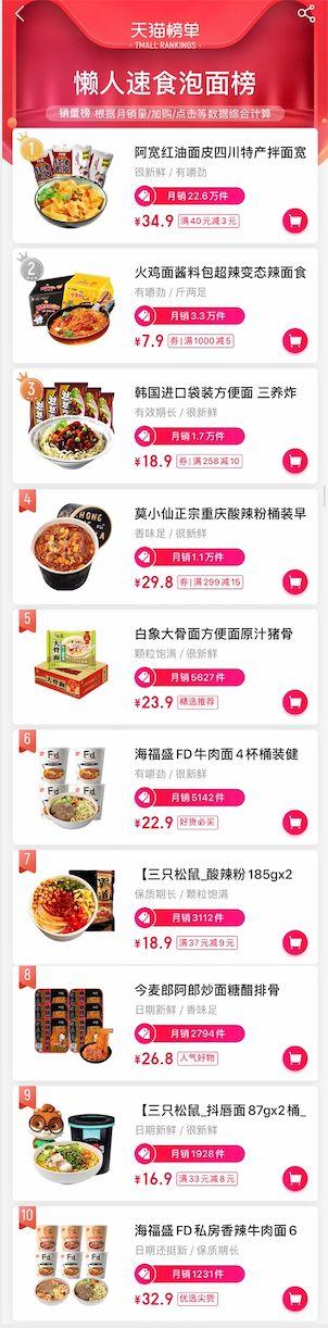 这样的创新也得到了市场的认可。在天猫榜单中的“懒人速食泡面榜”中,前十名只有5个是传统定义中的“方便面”,剩下5个都是酸辣粉、红油面皮等创新型的速食面产品。