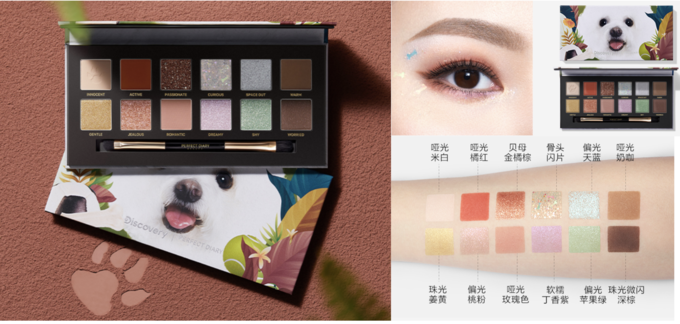 继去年爆火的小猪、麋鹿盘之后,完美日记推出全新萌宠系列“猫咪、小狗盘”眼影。其中,小狗盘的封面照就是“口红一哥”李佳琦的爱宠never。李佳琦在个人直播间曾表示这盘眼影的色彩搭配由他本人亲自挑选,共12种颜色,包含哑光、珠光、细闪、亮片等质地,同时融入了狗骨头形状的亮闪片。