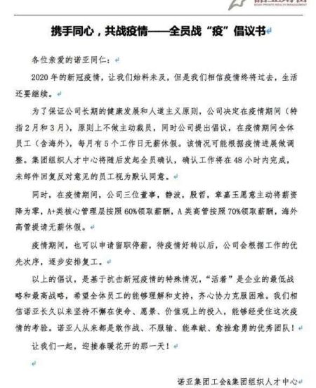 疫情期间,诺亚财富发布了一封全员战疫倡议书。