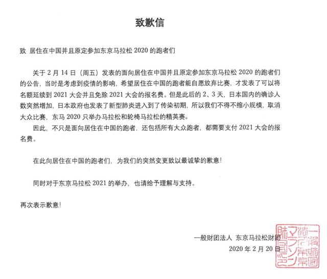 在2月6日,东京马拉松组委会又在官网发布了一则《关于新冠病毒感染的进一步措施》通告。通告表示,将保留中国跑者名额至2021年,但不退还报名费,并还需要再次支付2021年报名费。
