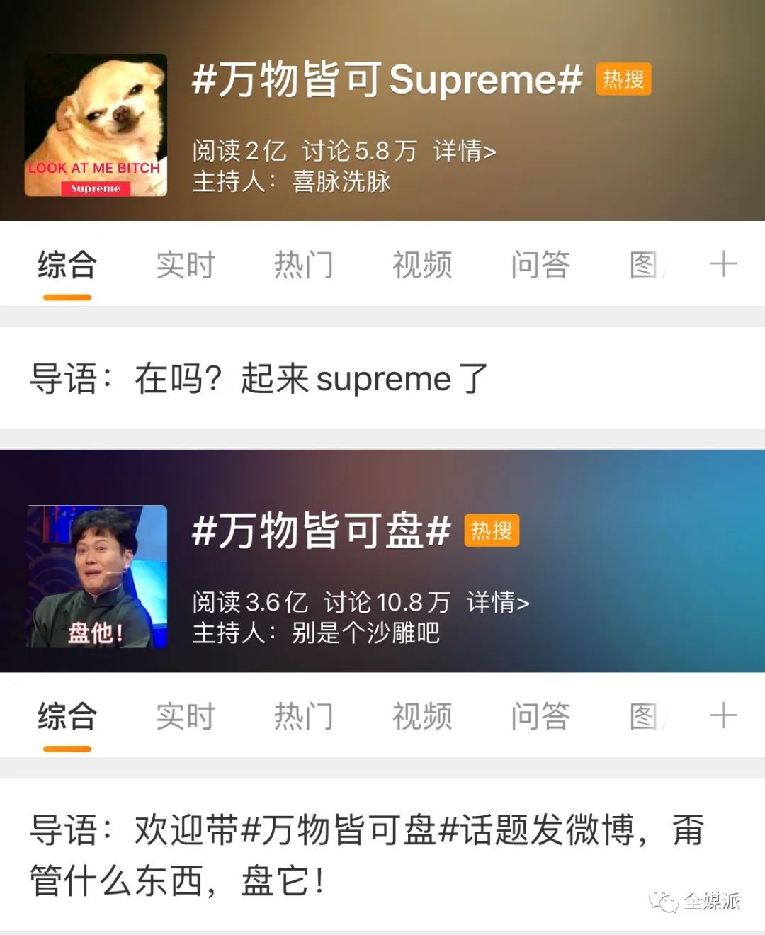 把时间拨回到“万物”的起源,你是否还记得2018年席卷短视频平台的#万物皆可Supreme#?无论是敷着面膜的小学生,还是无厘头的都市青年,抑或是尬舞的大爷大妈们,不同角色轮番上阵,在一段意义不明的视频里盖上Supreme的LOGO,叠加嘻哈迷幻的滤镜,最后再配上一段动感电子音乐,一股时尚时尚最时尚的潮流气息便扑面而来。