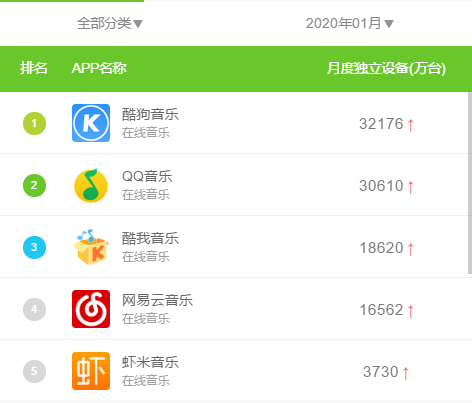 根据艾瑞指数数据,截止到2020年1月,国内音乐平台市场仍呈现出“一超一强”的局面。酷狗音乐、QQ音乐、酷我音乐分别以3.2亿、3.1亿、1.9亿的月独立设备数位列前三,紧随其后的网易云月独立设备数为1.65亿。