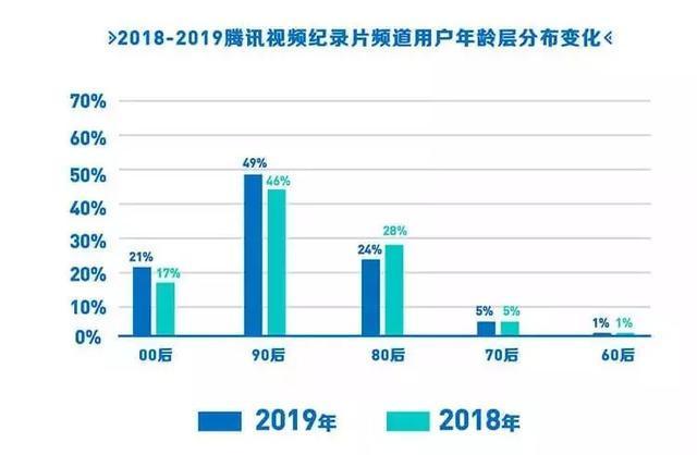 不止于以年轻小众文化为标签的B站,《2019腾讯视频年度指数报告》同样显示:腾讯视频纪录片频道的00后用户,从2018年的17%上涨至2019年的21%,90后用户从2018年的46%上涨至2019年的49%,80后用户从2018年的28%下降至2019年的24%,70后和60后用户占比2018年与2019年均为5%和1%。