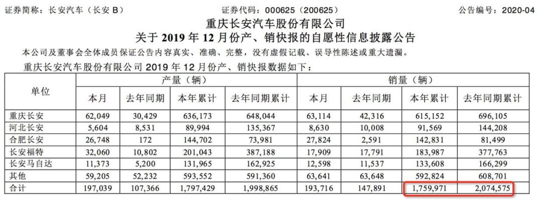 在2019年业绩预报中,长安汽车将业绩下滑原因,归咎于销量的下滑。据长安汽车披露的产销数据,2019年其共计售出176万辆车,同比下滑15.16%。
