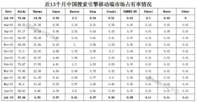 从图中我们可以很直观的看到,移动端市场占有率方面,百度为 87.63%,神马为 6.95%,搜狗为 3.97%,必应为 0.57%,好搜为 0.41%,谷歌为 0.36%。从趋势上来看,百度一直稳居第一,神马第二,搜狗第三,不过根据数据变化,百度一直稳步上升,而神马一直在下降,当然,搜狗也在下降,但是幅度很小,意味着依托搜狗输入法,搜狗很有可能下次统计,就超过神马了。