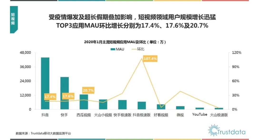 由于宅家时间漫长,无论是创作,还是观看,短视频都成为人们打发时间、缓解情绪的重要方式。根据Trustdata数据显示,1月抖音快手的DAU就分别达到历史峰值,受疫情影响,短视频的用户规模增长迅猛,抖音、快手的MAU环比增长都达到17%左右。