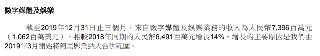 2月13日,阿里巴巴(HK9988)发布了2019年12月份季度业绩公告(2019.9.30-2019.12.31止),其中数字媒体及娱乐业务(优酷、阿里影业、大麦等)业务依旧萎靡,季度收入为73.96亿元人民币,与去年同期的64.91亿相比增长了14%,经营亏损39.60亿,上年同期经营亏损70.97亿,同比下降43%。