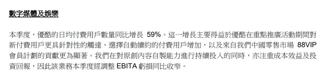 阿里文娱旗下的优酷公司虽然没有公布明确的付费用户数量,但也提到优酷的日均用户数量同比增长59%,这一增长主要得益于在重点推广活动中对新付费用户更具针对性的触达以及“88VIP会员计划”的贡献。