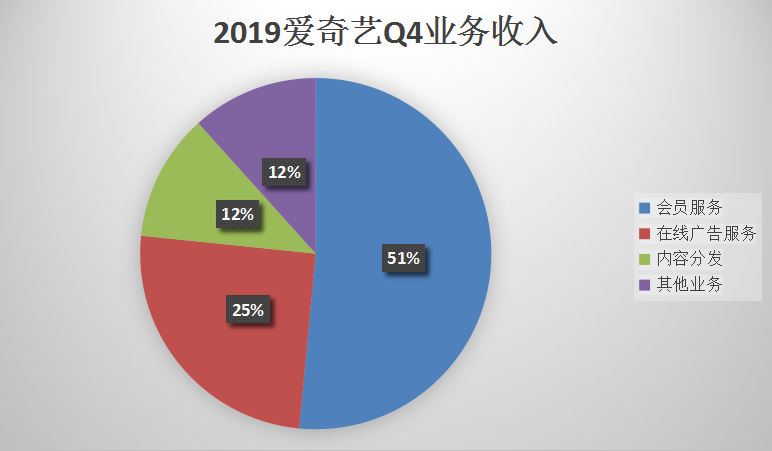 根据公告显示,2019年爱奇艺公司第四季度实现会员服务业务收入38.61亿元;在线广告服务业务收入18.83亿元;内容分发业务收入8.78亿元;其他业务收入8.74亿元。其中会员服务业务成为营收业务的半壁江山,占比高达51.5%。