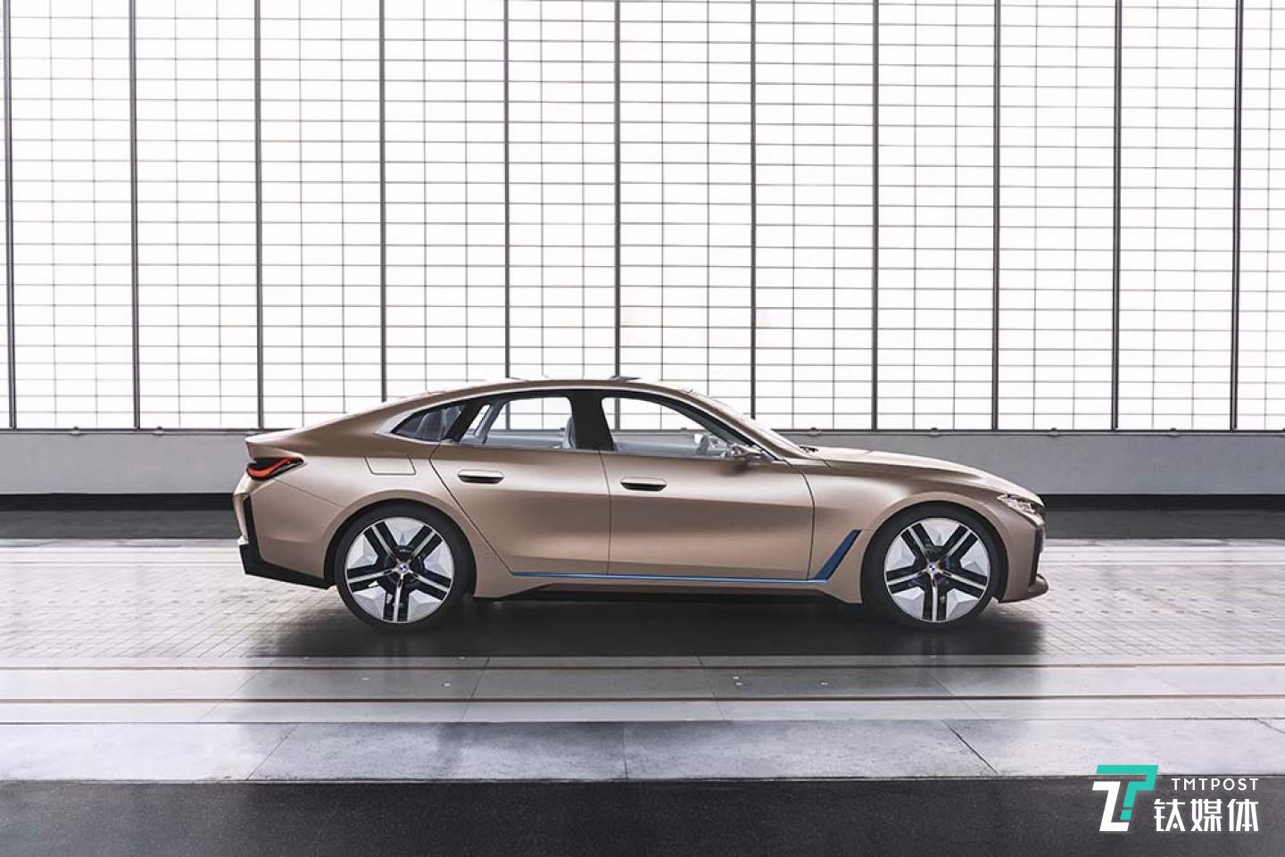 纯电动BMW i4概念车采用全新电气化设计语言,拥有时尚、优雅的外观,明快、流畅的线条和紧致的车身表面勾勒出时尚的雕塑感,搭配极具现代感的“磨砂亮铜色”车身漆,视觉效果较为震撼。