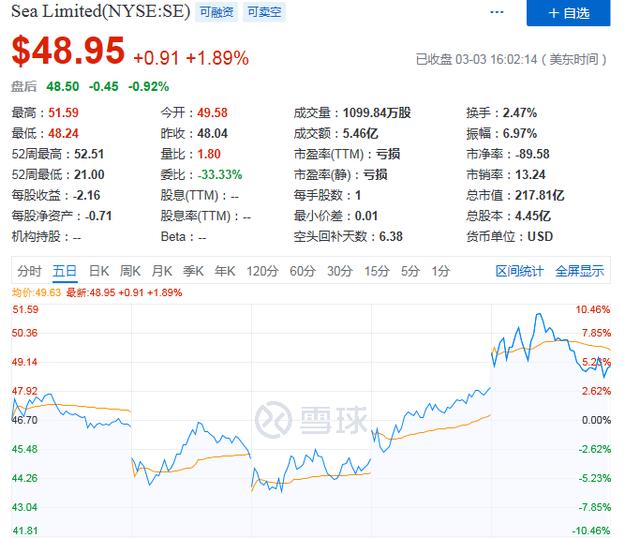 财报发布后,截止3月3日收盘,Sea Limited股价为48.95美元,涨了1.89%,市值为217.81亿美元。