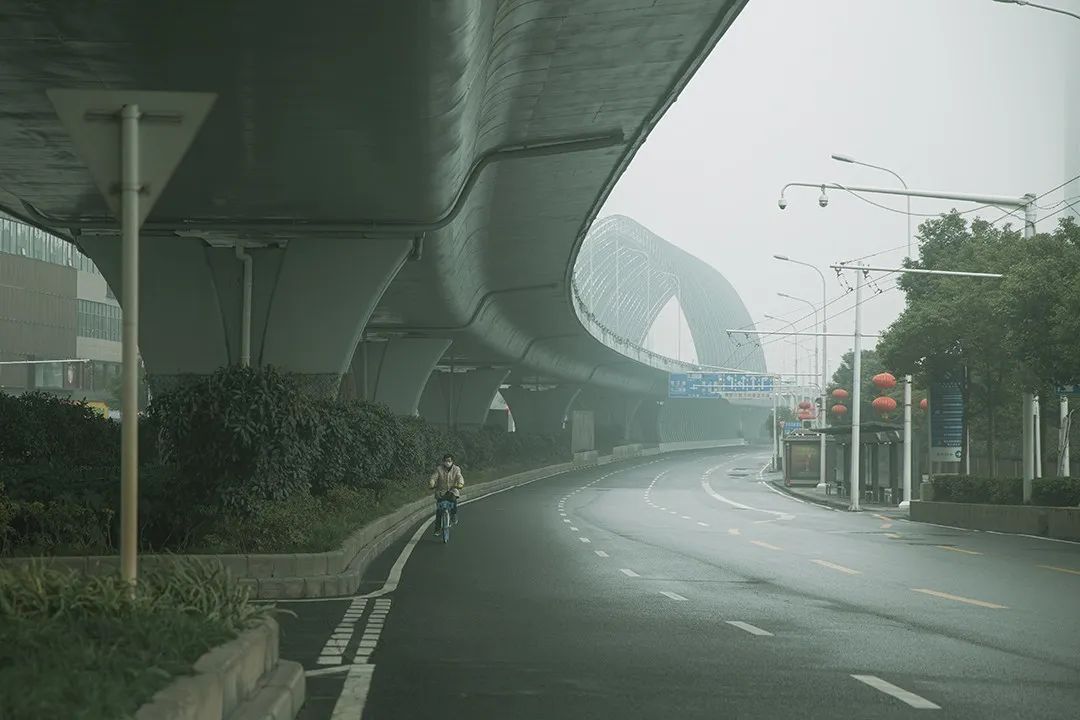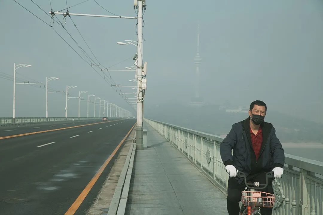 戴着口罩手套骑行过桥的武汉人 图丨炀燚