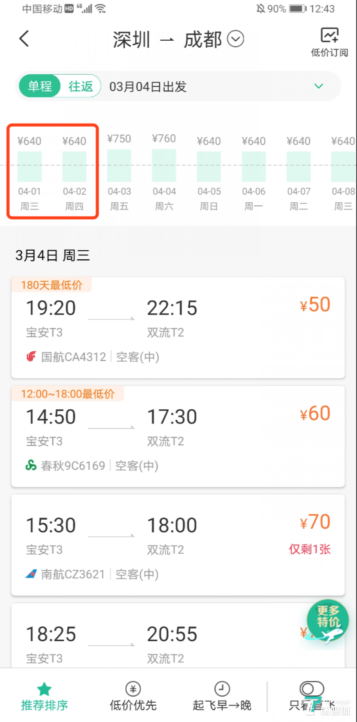 综合其他OTA平台查询结果发现,北上广深等城市前往多地的机票都很便宜,不过4月之后票价全线上涨,其中深圳飞成都涨至640元以上,4月最高票价达到1450元。