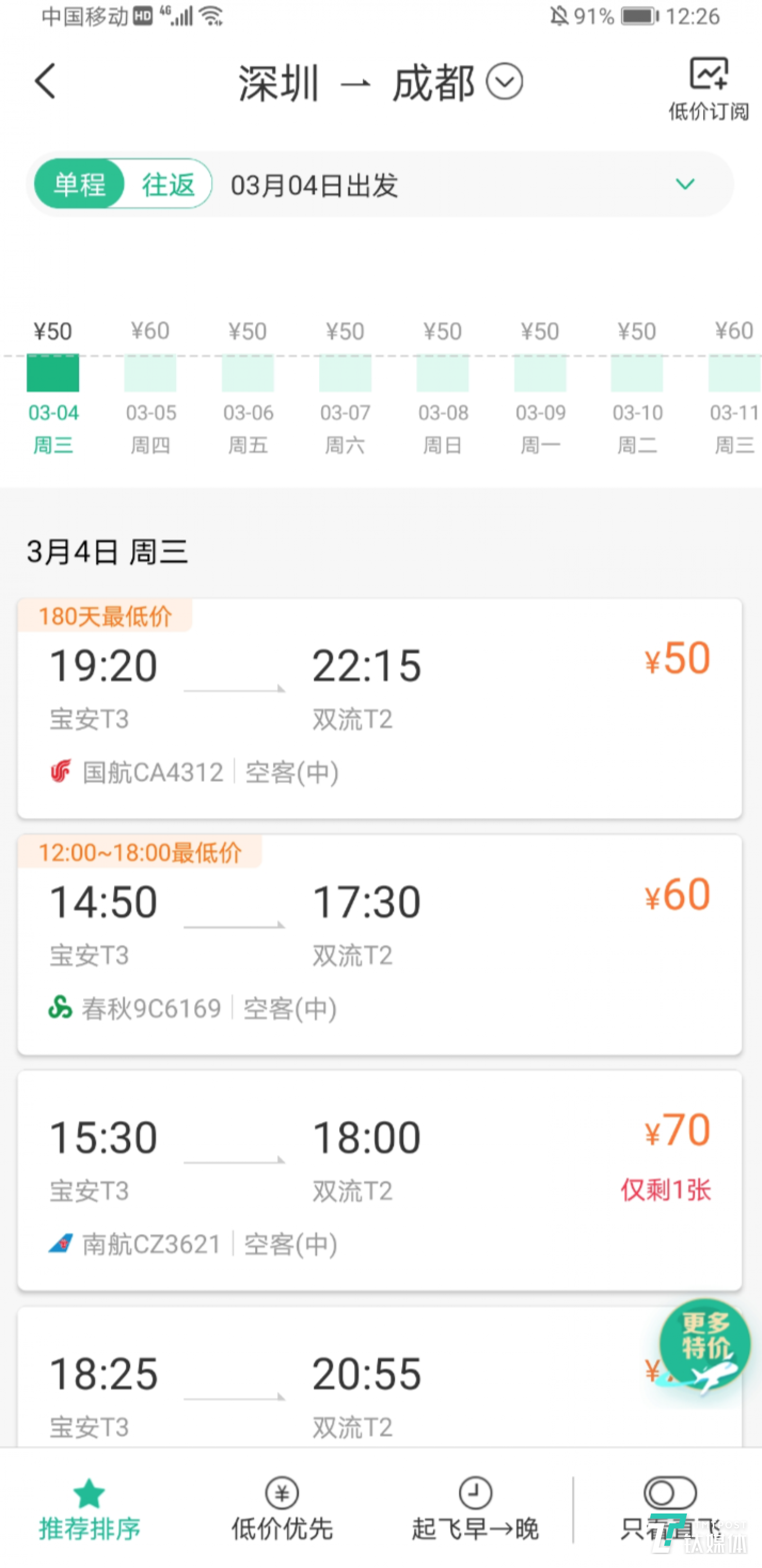钛媒体在携程旅行平台查询到,深圳飞成都的单程机票,本月票价最低为50元(不含机建燃油费,下同),不过月底攀升到150元;广州到重庆本月最低仅为70元,月底票价也出现小幅度上升,达到100元。