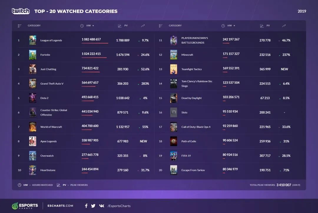 很难想象,2018年还位于Twitch全类别第4的《PUBG》,2019年下降7位,损失了近46.7%的总时长,其也成为2019年失去观众最多的Twitch游戏。