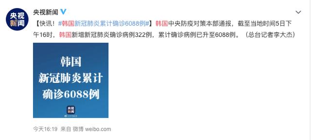 截止3月5日16时许,韩国新冠肺炎新增确诊病例322例,累计确诊病例达到6088例。
