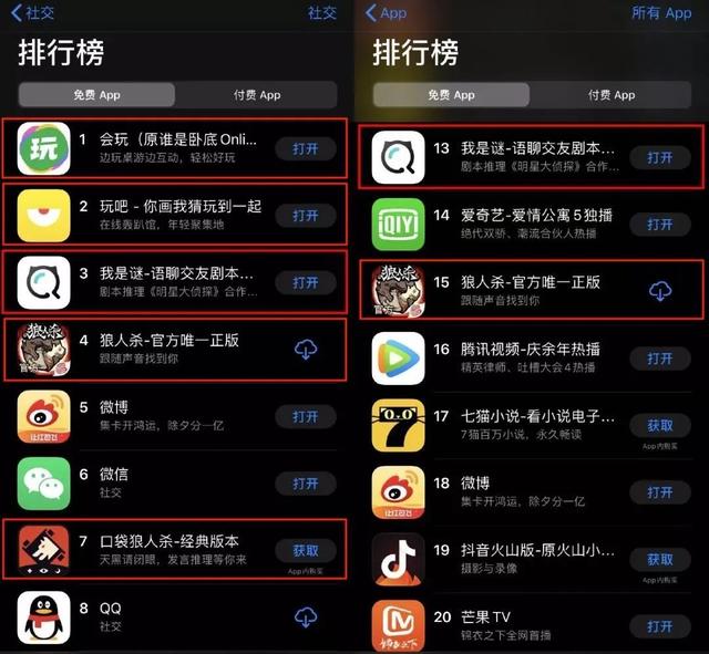 细分品类中,以狼人杀、剧本杀为代表的在线桌游增长势头迅猛。线上剧本杀App“我是谜”春节期间数据增长超一倍,最火爆时曾排在苹果商店社交榜第三名;网易《狼人杀》一度登上社交类应用榜第三位,仅次于QQ与探探两大应用,《天天狼人》也在上线4年后再一次冲进总榜,进入社交应用畅销榜Top20。